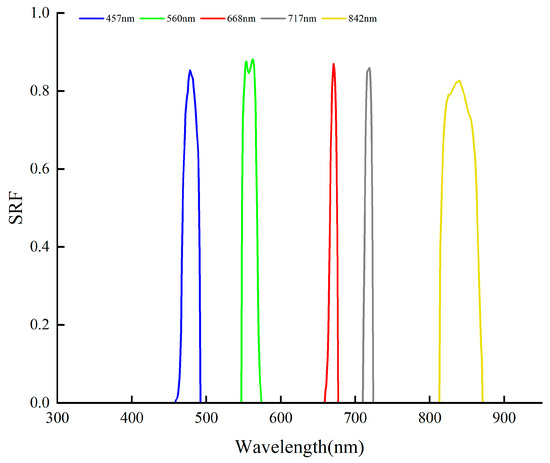 The spectral response function (SRF) for each band was calculated based on the transmittance of the respective band filter of the RedEdge-P multispectral sensor. Simulated spectral reflectance was then resampled to the center wavelength of the RedEdge-P sensor according to the SRF (Figure 3), in order to construct the equivalent spectral reflectance of the simulated band information. The equivalent spectral reflectance based on the RedEdge-P spectral response function is calculated as follows [23]: