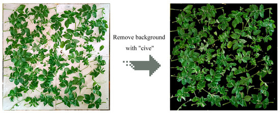 Six plants were collected from each plot. The leaves, stems, roots, underground stems (excluding the tuber), and tubers were separated. The leaves were then killed at 105 °C for 30 min, followed by drying at 85 °C until the biomass reached a constant weight. Afterward, the dry matter weight was measured. Dry matter content (g·cm−2) was calculated as the above-ground biomass per unit area. Before weighing the fresh weight of the samples, leaf images were captured using a camera. Leaf image extraction was then performed by separating the plant from the background through threshold segmentation (Figure 4). The leaf area index was derived from the pixel occupancy of the leaf area. Equivalent water thickness and dry matter content were calculated from the measured leaf area, dry weight, and fresh weight. During the same period, three plants were selected from each plot, and four leaves from each plant were brought back to the laboratory. Each leaf sample, with an area of 2.5 cm2, was weighed to 0.1 g. The samples were then immersed in 96% ethanol until the material turned white. Absorbance measurements were taken with a UV spectrophotometer at 470, 649, and 665 nm wavelengths. These measurements were used to calculate the chlorophyll and carotenoid content (in mg/g) by combining the absorbance data with the mass of the samples. The calculation formula is as follows: