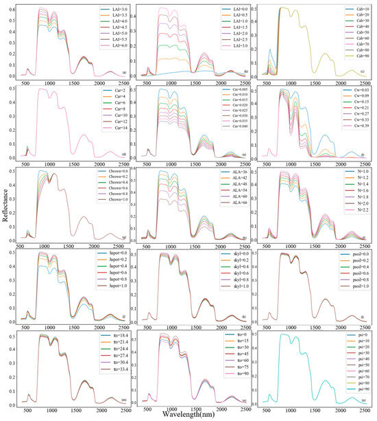 Figure 5. Local sensitivity analysis of PROSAIL model parameters. Figures (a,b) show the variation in spectral reflectance at 400–2500 nm for 3 < LAI < 6 and 0 < LAI < 3; (co) show the effects of Cab, Car, Cm, Cw, Cbrown, hspot, ALA, N, skyl, psoil, tts, tto, and psi on the spectral reflectance at 400 nm–2500 nm, respectively.