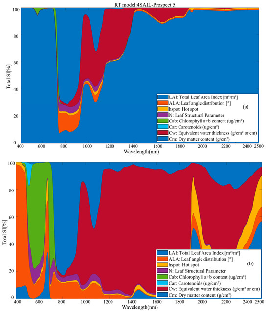 Figure 6. Global sensitivity analysis of the main PROSAIL model parameters: (a) the result of global sensitivity analysis for 0 < LAI < 3; (b) the result of global sensitivity analysis for 3 < LAI < 6.