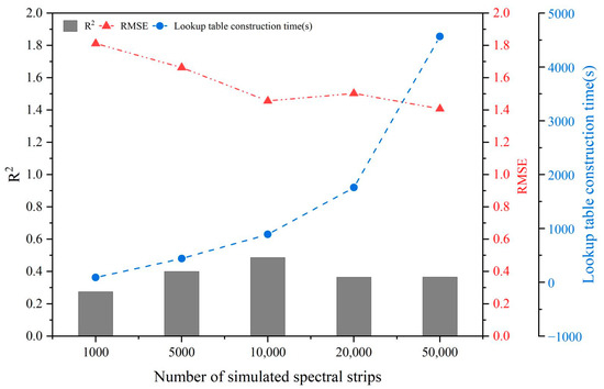 With the increase in the number of simulated spectra included in the lookup table, the accuracy of the LAI inversion model based on PROSAIL improves (Figure 7); however, when the number of simulated spectra exceeds 10,000, the time required to construct the LUTs increases significantly, while the accuracy of the LAI inversion model starts to decrease. Figure 7 shows that the construction times for LUTs containing 1000, 5000, 10,000, 20,000, and 50,000 spectral data took 88.577 s, 440.864 s, 889.426 s, 1761.24 s, and 4568.293 s, respectively. Using LUT1 with 1000 simulated data, the modeling R2 is 0.28 and RMSE is 1.81. When the simulated spectral data in LUT1 increased to 10,000, R2 increased by 89.82% and the RMSE reduced by 57.51%. In addition, when the simulated spectra in the LUT exceeded 10,000 and continued to increase, the accuracy of the LAI inversion model decreased. This may be due to the larger lookup table amplifying the effects of the phenomenon where “different parameters have the same spectral reflectance” on the model results. Based on the above results, LAI retrieval was conducted using the LUT containing 10,000 simulated spectra.