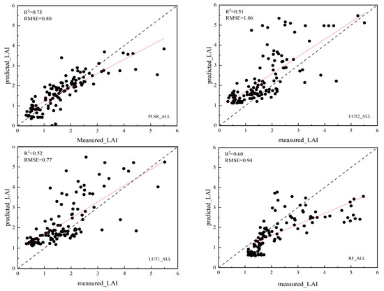 The LAI inversion results for each stage or variety based on field-measured data showed that the validation R2 of the RF model for the LAI estimation across five stages or varieties ranged from 0.41 to 0.80 (Table 5). The model using the PLSR algorithm for the LAI inversion was more stable than those of RF, and the LAI inversion result was the best for the different stages or varieties, with the R2 of the model verification ranging from 0.57 to 0.94.