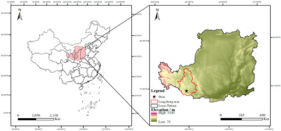 The study area (Figure 1) is located in Wenfeng Town of Longxi County in Gansu Province, China (104°40′05″–104°40′30″ E, 35°3′10″–35°3′20″ N, altitude: 2180 m a.s.l.) [1]. The region exhibits a mean annual temperature of 6–7 °C and a mean annual precipitation of 450 mm (Table 1) [1]. Rainfall is the only water source for plant growth, where the soil is classified as secondary loess soils, according to Xie et al. [27]; the soil pH value is 8.50 [28].