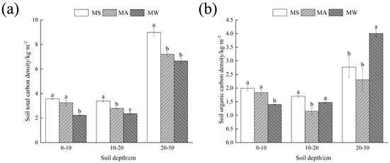 Soil total carbon density (a) and organic carbon density (b) of different crop rotation methods. Statistical test used; letters indicate significant differences in diversity (p < 0.05). MA, maize–alfalfa rotation; MS, maize–sainfoin rotation; MW, maize–wheat rotation.