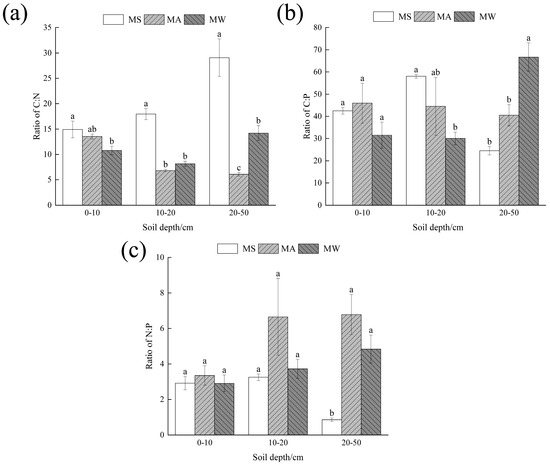Significant differences (p < 0.05) in the soil layer C/N among the different planting types were found in the 0–10 cm and 20–50 cm soil layers. However, the magnitudes of the differences varied. In the 0–10 cm soil layer, the order was MS > MA > MW, while in the 10–20 cm and 20–50 cm soil layers, it was MS > MW > MA (Figure 3a).