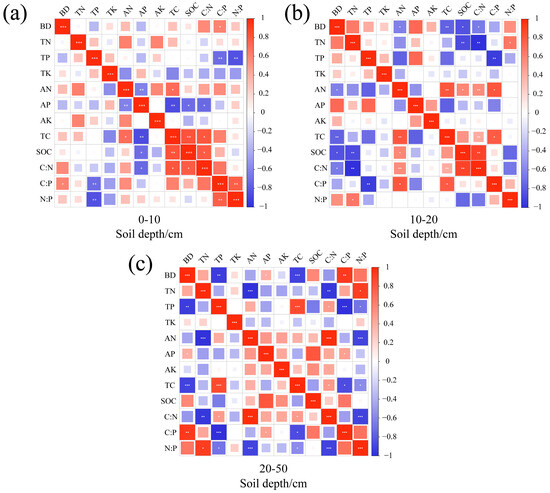Correlations between soil nutrients and their stoichiometric ratios under different soil depths. (a–c) represent the 0–10 cm soil layer, 10–20 cm soil layer, and 20–50 cm soil layer respectively. Red symbolizes a positive correlation, whereas blue stands for a negative one. Moreover, the darker the color is, the stronger the correlation is. BD, bulk density; SOC, soil organic carbon; TN, total nitrogen; AN, soil alkaline nitrogen; TP, total phosphorus; AP, available phosphorus. TK, total potassium; AK, soil available potassium; TC, soil total carbon. * p < 0.05; ** p < 0.01; *** p < 0.001.