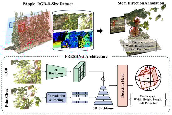 First, we reprocessed existing apple datasets, Fuji-SfM [,] and PApple_RGB-D-Size []. The 3D apple detection datasets were reconstructed by annotating the stem direction, considering the potential application. We also designed a 3D detection framework named FRESHNet, introducing a loss function and modified fusion strategy.