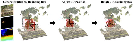 In order to obtain information about the stem direction of the apples, we manually annotated 3D bounding boxes and stem directions. Due to self-occlusion, where parts of the apple were partially obscured by other parts of the apple, the reprocessed point cloud was unable to acquire information about the back of the apple. Therefore, we determined the volume information based on the actual diameter, automatically generated an initial 3D bounding box from the segmentation mask position, and refined it to accurately annotate the location of the 3D bounding box within the point cloud, as well as the stem direction. The step-by-step procedure for annotating the stem direction is shown in Figure 2.