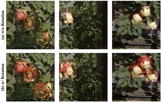 Figure 4 is a visualization of the KDE distribution of the stem direction of the annotated apples, and it shows that the upright direction had the densest distribution, but there was a wide range of other stem directions. Apple harvesting necessitates identifying, cutting, or rolling the stem according to its direction. However, as shown in Figure 4, the direction of the stem is inconsistent, making it unfeasible to conduct batch work based on the stem of apples during crop cultivation. Therefore, apple detection that considers the stem direction of the fruit tree is necessary to automate the entire process of cultivation.