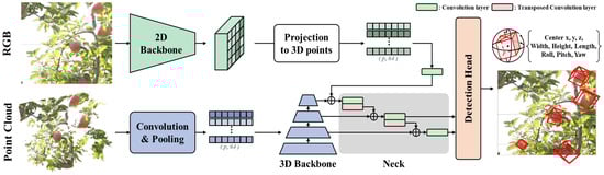 The input data consist of a point cloud and an image. A 3D backbone processes the points, while a 2D backbone and FPN process the image to extract features. The 3D features given by the 3D backbone are fused with image features in the 3D neck, resulting in a feature that integrates information from both the image and points. Details of the fusion method are provided in Section 2.3.1. The detection head uses this fusion feature as input to predict the class, bounding boxes, and 3-axis rotation. The output is a set of 3D object bounding boxes , where represent the center coordinates of the bounding box; indicate its width, height, and length; and denote the rotation angles around the x, y, and z axes, respectively.