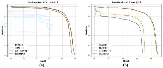 Firstly, the FRESHNet achieved outstanding performance for all metrics. Notably, rot-TR3D+FF achieved a significant performance improvement of 20.19% for AP@0.5 compared to TR3D+FF. Similarly, rot-Point-GCC+TR3D showed a 37.97% enhancement in AP@0.5 relative to Point-GCC+TR3D, with notable improvements in AR also measured. This suggests that identifying the stem direction of apples provides a more precise comprehension of their location, particularly in the context of harvesting. In addition, FRESHNet showed an improvement of 0.38% for AP@0.25 and 1.07% for AP@0.5 compared to rot-TR3D+FF. This demonstrated the effectiveness of the fusion of semantic information from images with the point cloud. Furthermore, our method achieved an FPS of 13.17, the fastest among the image fusion methods, demonstrating improvements in real-time detection performance with a simple yet effective image fusion approach. Additionally, we visualized a PR-curve for each method, as shown in Figure 6.