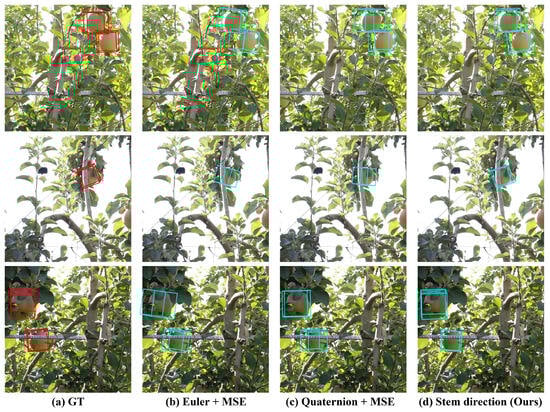 Figure 7 provides a qualitative assessment of the efficacy of the stem direction loss design. As seen in Figure 7b–d, the results trained with our proposed stem direction loss predicted the 3-axis rotation of the apples more effectively than those trained with Euler+MSE and Quaternion+MSE loss, thereby accurately estimating the stem direction. The results indicate that our stem direction loss function effectively estimated the direction of the apple stems. Consequently, we finally chose the stem direction loss function.