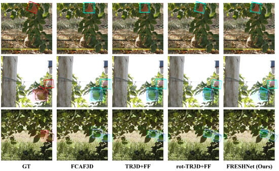 In this section, we discuss the strengths and limitations of the proposed framework. First, our approach takes into account the 3-axis rotation of the stem, enabling the model to more precisely recognize the location of apples by considering various directions of the stem. Figure 8 shows that although FCAF3D [] and TR3D+FF [] detected the apples, they did not accurately estimate their dimension and location in relation to the GT. In contrast, both rot-TR3D+FF and FRESHNet could detect the apples more precisely by estimating the stem direction. FRESHNet predicts rotational bounding boxes by considering the stem direction, leading to tighter and more precise predictions of the apple dimensions and location compared to methods that overlook 3-axis rotation. Our approach can enhance the precision of apple 3D vision in automated robot harvesting in orchard environments.