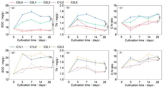 Soil organic carbon (a), total nitrogen (b), and C:N ratio (c) under separate addition of litter and cellulase treatments. Soil organic carbon (d), total nitrogen (e), and C:N ratio (f) under mixed litter and exogenous cellulase addition treatments. * p < 0.05, ** p < 0.01.