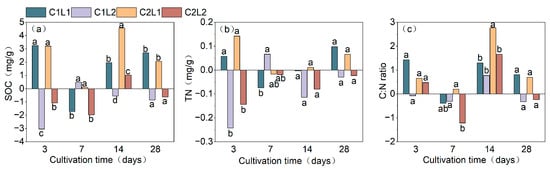 Contribution of exogenous cellulase addition to soil organic carbon (a), total nitrogen (b), and C:N ratio (c) during litter decomposition. Column lengths indicate the value for that treatment at that time minus the value for the litter addition-only treatment. Different lowercase letters indicate significant differences (p < 0.05) between different treatments at the same cultivation time.
