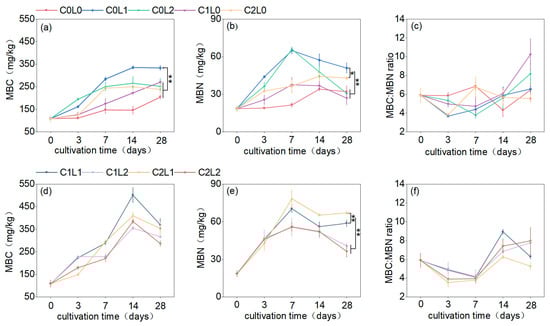 Soil microbial biomass carbon (a), microbial biomass nitrogen (b), and microbial biomass carbon-to-microbial biomass nitrogen ratios (c) under litter and cellulase addition treatments alone. Soil microbial biomass carbon (d), microbial biomass nitrogen (e), and microbial biomass carbon-to-microbial biomass nitrogen ratios (f) under mixed litter and exogenous cellulase treatments. * p < 0.05, ** p < 0.01.