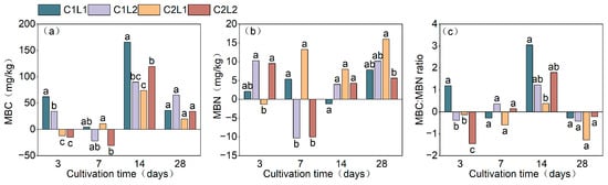 Contribution of exogenous cellulase addition to soil microbial biomass carbon (a), microbial biomass nitrogen (b), and microbial biomass carbon-to-microbial biomass nitrogen ratios (c) during litter decomposition. Column lengths indicate the value for the treatment at a given time minus the value for the litter-only addition treatment. Different lowercase letters indicate significant differences (p < 0.05) between different treatments at the same cultivation time.