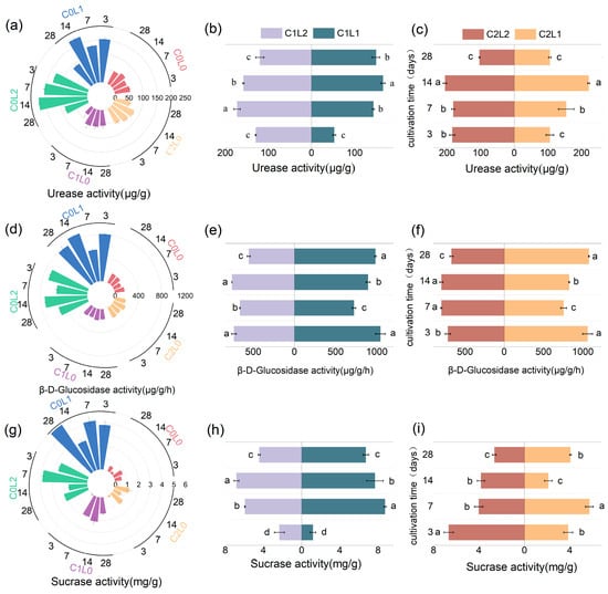 Soil urease activity (a), β-glucosidase (d), and sucrase activity (g) under litter and cellulase treatment alone. Soil urease activity (b,c), β-D-glucosidase (e,f), and sucrase activity (h,i) under litter with cellulase treatment. Different lowercase letters indicate significant differences between treatments (p < 0.05).