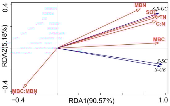 The two-way ANOVA results showed that the type of litter addition had a significant impact on SOC, TN, the C:N ratio, MBC, MBN, and the MBC:MBN ratio. In contrast, exogenous cellulase addition had significant effects only on MBC, MBN, and the MBC:MBN ratios and had negligible effects on SOC and TN (Table 3). Redundancy analysis (RDA) visualizations revealed the relationships between soil enzyme activities and soil attributes, with RDA1 and RDA2 together explaining 95.75% of the variance in soil enzyme activities (Figure 6). The primary determinants of soil enzyme activities were five environmental variables: SOC, TN, the C:N ratio, MBC, and MBN, with SOC having the greatest influence. The RDA analysis depicted positive associations between SOC, TN, the C:N ratio, MBC, and MBN and enzyme activity, whereas a negative correlation was observed with the MBC:MBN ratio. Specifically, S-SC and S-UE activity were more significantly influenced by MBC, while S-β-GC was more affected by SOC and TN. In this study, litter addition significantly affected soil carbon and nitrogen contents, which, in turn, influenced microbial carbon and nitrogen sequestration and release, ultimately contributing to increased enzyme activities. Although exogenous cellulase addition did not directly alter soil carbon and nitrogen contents, it indirectly promoted enzyme activity by stimulating microbial growth.