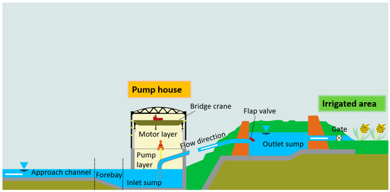 Pumping stations are a common category of hydraulic energy-consuming infrastructure. They perform essential functions such as water transfer, agricultural irrigation [1], drainage, and environmental enhancement by lifting water from lower to higher elevations. While these stations effectively mitigate issues like the uneven distribution of precipitation and urban flooding, they also present significant energy consumption challenges. Problems such as mainstream inlet flow deviation and operating outside optimal conditions not only substantially increase the energy consumption of pumping stations, but also cause vibration and noise, which also exists in other areas [2]. To achieve energy conservation and efficiency, it is crucial to address and minimize these issues. Figure 1 illustrates the pivot arrangement of a small- and medium-scale irrigation pumping station.