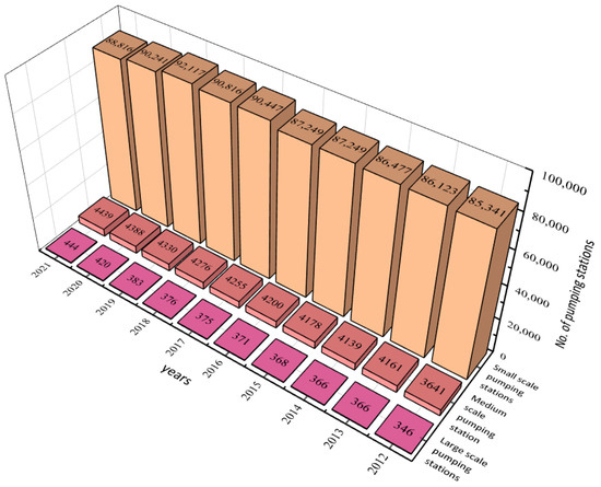 According to the literature [3], irrigation pump stations are generally categorized as small, medium, or large based on the design flow rate. Specifically, when the design flow rate is less than 10 m3/s, the pump station is considered to be small. When the design flow rate ranges from 10 m3/s to 50 m3/s, the pump station is categorized as medium-sized. And when the design flow rate exceeds 50 m3/s, the pump station is designated as large. Recent statistics indicate that small- and medium-scale pumping stations constitute 99.53% [4] of all stations in China, highlighting them as a primary focus for energy-saving initiatives. Figure 2 depicts the trends in the development of pumping stations in China.