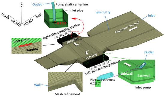 Computational domains, including the approach channel, forebay, sump, and inlet pipe, are established. The water from the approach channel enters through the left and right stations on both sides of the forebay, respectively, to reach the sump. In the figure, the left-side pumping stations are numbered 1#, 2#, 3#, 4#, and 5#, while the right side is numbered 6#, 7#, 8#, and 9#. Finally, the water flows out from the inlet pipe, as indicated by the white arrows.