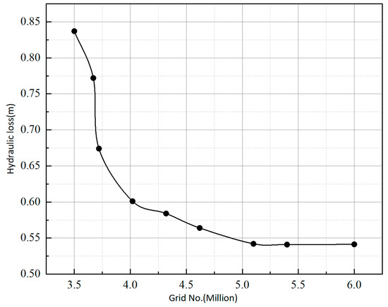 The total hydraulic loss of the computational domain is calculated using various grid case studies and the values are plotted in a trend graph, as depicted in Figure 4. Once the number of grids surpasses 5.4 million, the hydraulic loss stabilizes. The calculation results meet the accuracy requirements while ensuring reasonable utilization of computational resources, leading to high computational efficiency.