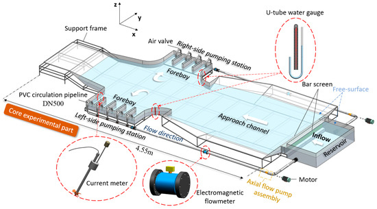 To investigate the flow characteristics of the pumping station forebay, an examination of the sump water flow is conducted using a transparent open pumping station circulation test rig. Figure 5 depicts the transparent open-type pumping station circulation experimental system. The test rig contains a water cycling loop and a data test and collection system. The water cycling loop is established with the approach channel, reservoir, auxiliary pump, PVC (Polyvinyl Chloride) pipelines and valve. The data test and collection system consists of a U-tube water gauge, electromagnetic flowmeter and velocity meter. White arrows denote the direction of water movement, annotated in blue font, while light blue font represents the free water surface. The entire experimental system comprises a recirculating circuit formed by various components depicted in the figure. The core study area, highlighted in red-orange, forms a 4.5 m loop comprising the approach channel, forebay, and left and right station sumps. PVC flanges connect these components to ensure that the water flows smoothly from the reservoir into the study area. The reservoir extends forward to match the height of the approach channel, with two bar screen segments installed for further flow control. The test rig includes the auxiliary axial flow pump device enclosed in the yellow boxed area, which is connected to the motor.