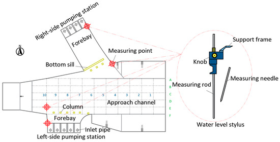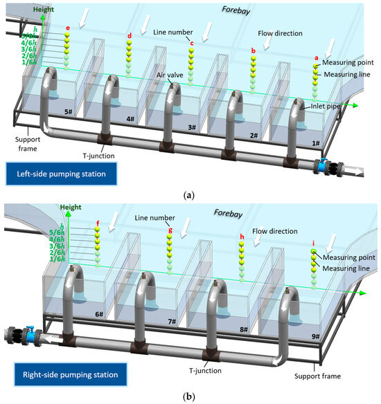 Layout of measuring lines and measuring points. (a) Left-side pumping station; (b) right-side pumping station.
