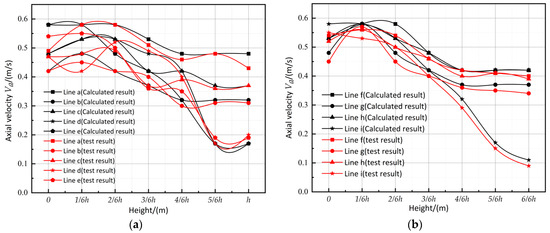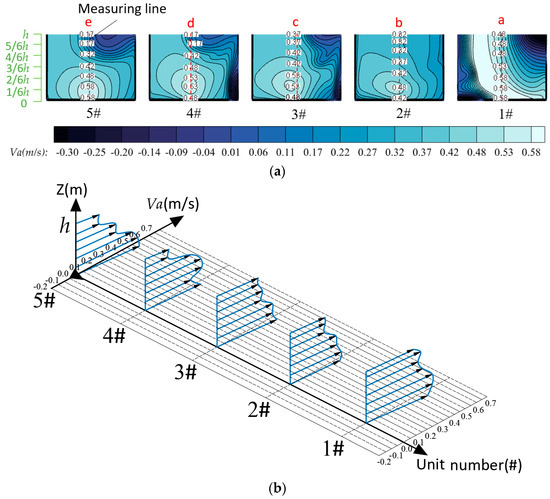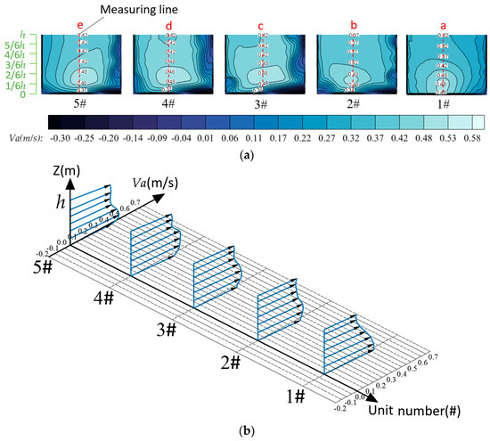 As shown in Figure 7, to validate the numerical simulation results, this section compares the axial velocity of the left- and right-side stations in the original case study with the numerical simulation by conducting model experiments. Specifically, multiple sets of data are obtained for each measuring point along each measuring line through repeated experiments. The average value for each point is taken, and these averaged experimental data are plotted together with the numerical simulation data. It is observed that the trend of the model experiment data is generally consistent with the trend of the numerical simulation results. To analyze the error between the numerical simulation and model test, the average of the seven data points along each measuring line is calculated to determine the mean axial velocity for each line. The experimental values of these mean axial velocities are then compared with the numerical simulation values, and the relative error between the two is calculated. The results indicate that the average relative error for the left station is 3.213%, while the average relative error for the right station is 5.107%. These values are within the acceptable error range, indicating that the numerical simulation results are reliable.