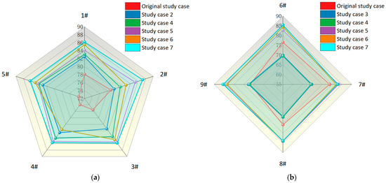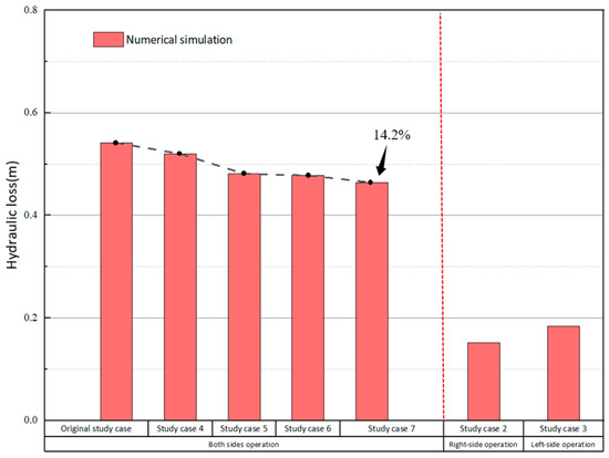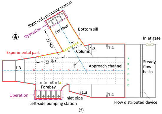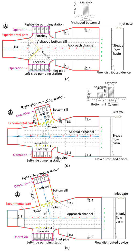 As shown in Figure 9, to explore the properties and suppression of large-scale vortices in the inflow structure, six case studies are proposed. Case study 2 and 3 involve moving the right-side pumping station as a whole away from the incoming flow by one unit. The operating conditions of the units are as follows: in case study 2, the right-side pumping station is shut down; in case study 3, the left-side pumping station is shut down. Case study 4 involves eliminating the panning of the unit and installing a V-shaped bottom sill with a rectangular sectional shape in the forebay. The operating conditions of the units are as follows: both left- and right-side pumping stations are operational. Case study 5 involves setting back the right-side pumping station by rotating it 15° in the direction of the inbound flow, lowering its elevation, and installing a rectification bottom sill and column. The operating conditions of the units are as follows: both left- and right-side pumping stations are operational. Case study 6 further extends the setback of the right-side pumping station, building on the adjustments made in case study 5. The operating conditions of the units are as follows: both left- and right-side pumping stations are operational. Case study 7 adjusts the swivel of the right-side pumping station according to the changes made in case study 6, rotating it by 30° in the direction of the incoming flow. The operating conditions of the units are as follows: both left- and right-side pumping stations are operational.