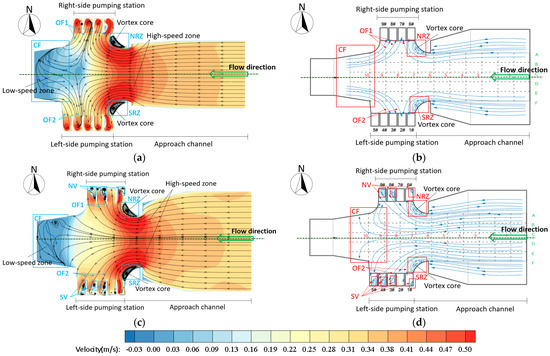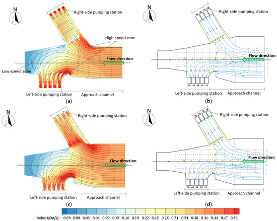 Streamlines and velocity contour charts of case study 6. (a) Bottom (numerical simulation); (b) bottom (test); (c) surface (numerical simulation); (d) surface (test).