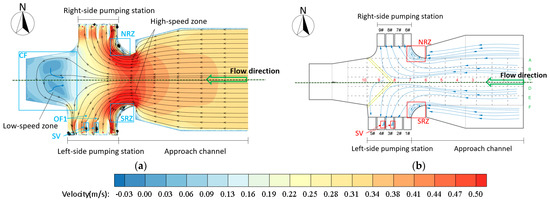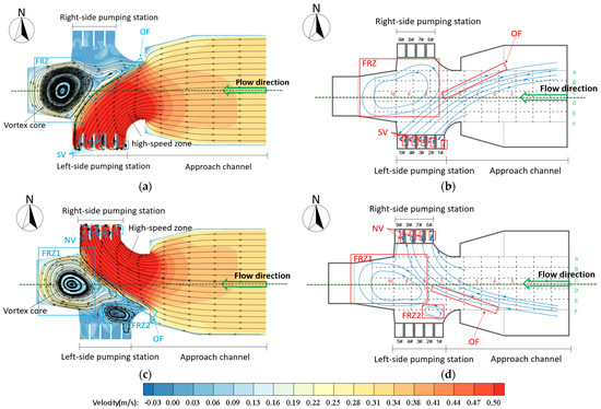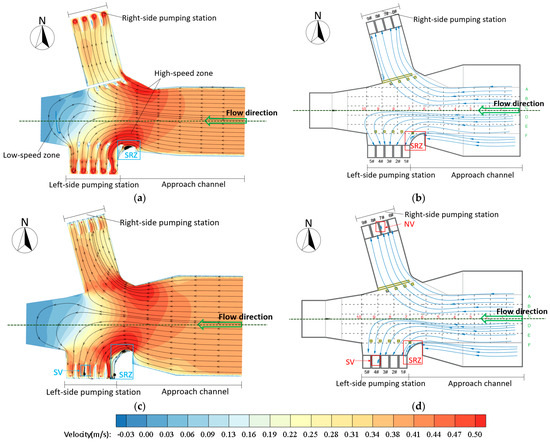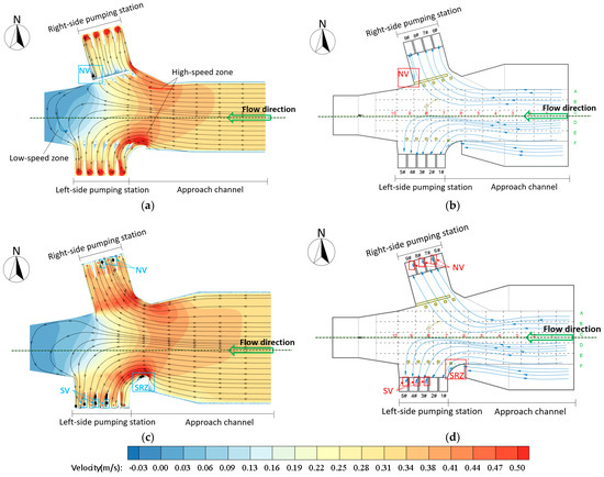 Case study 4 involves continuing the opening of the left and right units and replacing them with the rectified bottom sills. This improvement is depicted in Figure 12. At the left station, while the flow behind the sill is turbulent, units 1#, 2#, and 5# and the leading edge of basins 7#, 8#, and 9# exhibit approximately positive flow. However, lateral sumps 3#, 4#, and 6# still show evidence of turbulence. At the left station, while the flow behind the sill is turbulent, units 1#, 2#, and 5# and 7#, 8#, and 9# exhibit approximately positive flow. However, the lateral sumps of 3#, 4#, and 6# still show evidence of turbulence. Moreover, the NRZ and SRZ are predominantly present at the entrance of sumps 1# and 6#, extending into the sumps, indicating inadequate improvement. At the right-side pumping station, sumps 7#, 8#, and 9# exhibit predominantly forward flow. Similarly, the model tests for this case study are labeled with the locations of NRZ, SRZ, SV.