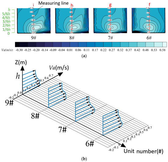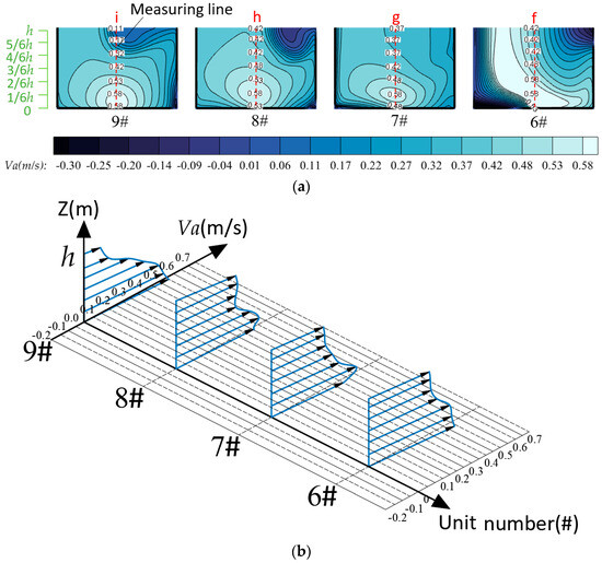 To facilitate the analysis of the rectification effect of each case study, all case studies in this study were conducted under specifically designed water level and flow rate conditions, namely, a designated water level of 37.5 m. The numerical simulation data were processed into flow contour plots, as depicted in Figure 10.