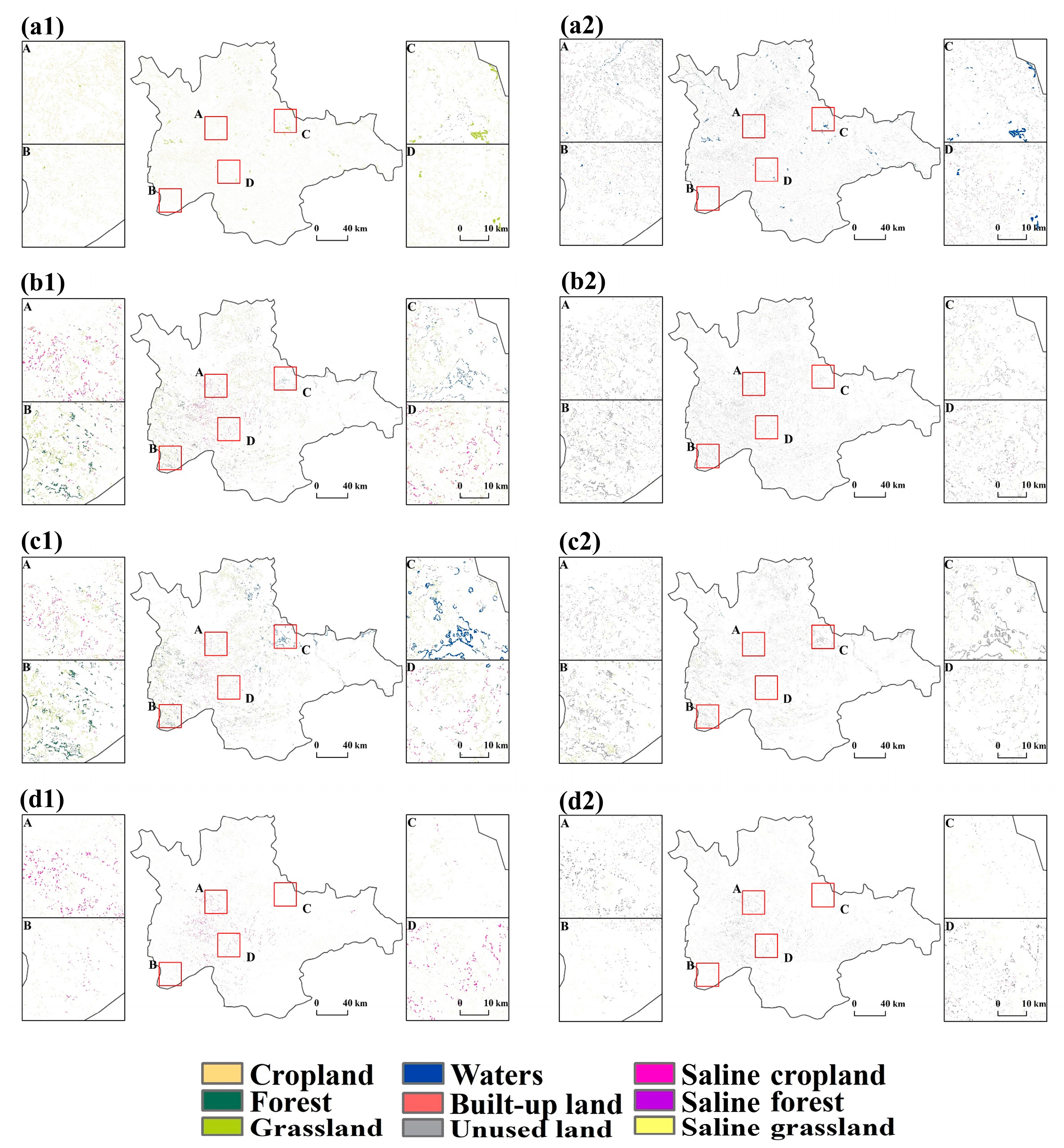 | The classification system of this study | Cropland, forest, grassland, waters, built-up land, unused land, Saline cropland *, saline forest *, saline grassland * |
