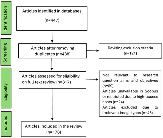 In August 2024, we conducted the literature search using the Scopus database and found a total of 447 articles. After removing duplicate entries, we were left with 438 articles. We then screened each article based on their titles and abstracts, resulting in 121 articles not meeting the required standards. This left us with 317 articles for further analysis. We proceeded with a full-text review to ensure that they met the predefined inclusion and exclusion criteria. Two independent reviewers evaluated each article to minimize bias, leading to the exclusion of 69 articles that focused on crops analyzed using sensors not intended for image analysis in this review. Furthermore, 24 articles were not available on Scopus or were only accessible through paid services with prohibitively high costs, limiting their accessibility. Furthermore, 46 articles were excluded because they analyzed irrelevant image types, such as satellite images. As a result, the systematic review included a total of 178 articles. Data extraction focused on collecting key information, such as the machine learning models used, performance metrics, and dataset sources. We used a predefined data extraction form to ensure consistency across the studies. Figure 1 provides a detailed description of these steps.