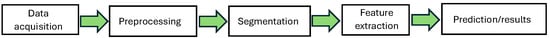 Flow diagram depicting the stages of data processing in the reviewed literature, including data acquisition, preprocessing, segmentation, feature extraction, and prediction/results. Each step is crucial for thorough data analysis and interpretation in various research domains.
