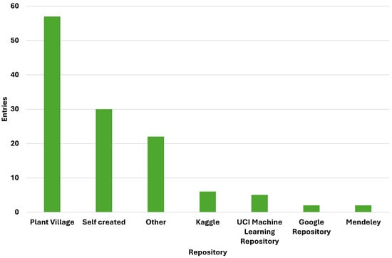 Plant Village []: Fifty-five papers used the Plant Village repository. This repository serves as a comprehensive resource for plant disease images, providing researchers with access to a diverse collection of annotated data.