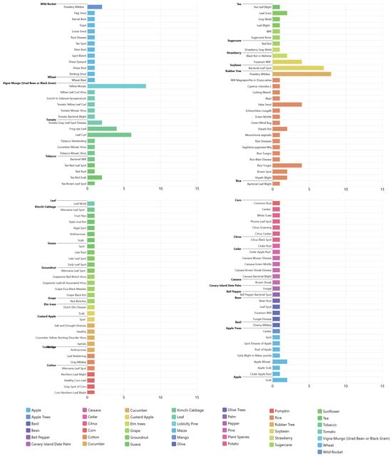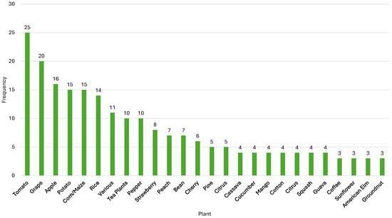 The research papers cover an extensive range of plant species, including common agricultural staples such as apples, corn, grapes, potatoes, and tomatoes. In addition, it explores more specialized crops like cassava and groundnut. The breadth of plant species under investigation is extensive. In addition, the articles explore various fruits, such as peaches and strawberries, showcasing the diversity of botanical specimens examined in the literature. The analysis also extends to trees such as pine and American elm, as well as ornamental plants such as sunflowers and barbary wolfberries, contributing to the diverse array of botanical topics explored in the research papers. The distribution of the different plants found in this review is illustrated in Figure 4.