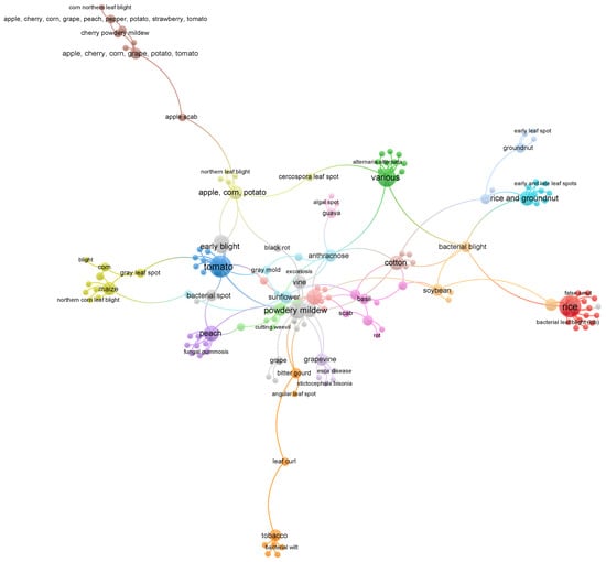 The articles analyzed covered a diverse range of plant diseases and pests affecting a wide range of crops and plant species. Diseases such as Powdery mildew, Downy mildew, Black root, early blight, Common rust, and Leaf Spot disease were frequently discussed, indicating their importance in agricultural research and plant pathology. In addition, various leaf diseases were common topics of investigation. Figure 5 shows the frequency of the diseases found in our analysis, and Figure 6 illustrates the relationships between plant species and their associated diseases. In this diagram, the central nodes represent the plant diseases, while each node at the end of a connection represents a specific plant species. The size of the disease nodes correlates with the number of plant species affected, indicating the prevalence and spread of these diseases among different plant species.