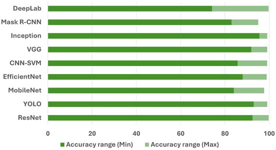 Ref. [] reports a precision of 97.81 in their Android app with the machine learning model that helps to identify mango disease. On the other hand, the works from [,,] exhibit metrics not mentioned in the present review, such as R and R2, among others.
