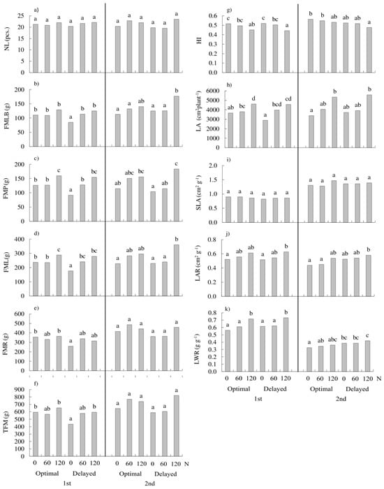 Effect of interaction between the sowing date (optimal, delayed) and the dose N (0, 60, 120) in the first and second growing seasons in sugar beet (a) NL, (b) FMLB, (c) FMP, (d) FML, (e) FMR, (f) TFM, (g) HI, (h) LA, (i) SLA, (j) LAR, and (k) LWR; data marked with the same lowercase (a, b, …) letters do not differ significantly according to Tukey’s test (p ≤ 0.05).