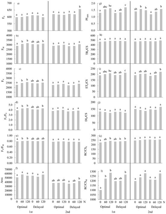 Effect of interaction between the sowing date (optimal, delayed) and the dose N (0, 60, 120) in the 1st and 2nd growing seasons in sugar beet (a) F0, (b) FM, (c) Fv, (d) Fv/F0, (e) Fv/FM, (f) Area, (g) PIABS, (h) TR0/CS, (i) ET0/CS, (j) DI0/CS, (k) RC/CS0, (l) RC/CSM; Data marked with the same lowercase (a, b, …) letters do not differ significantly according to Tukey’s test (p ≤ 0.05).