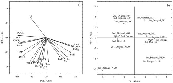 Results of principal component analysis (PCA) (a) presenting relationships between all analyzed parameters and (b) for the condition of growth (growing season: 1st, 2nd; sowing date: optimal, delayed and N fertilization: 0, 60, 120 kg ha−1). Analyzed parameters: NL—number of leaves, FMLB—fresh mass of leaf blades, FMP—fresh mass of petioles, FML—fresh mass of leaves, FMR—fresh mass of beetroot, TFM—total fresh mass, HI—harvest index, LA—leaf area, SLA—specific leaf area, LAR—leaf area ratio, LWR—leaf weight ratio, F0—minimal fluorescence, FM—maximal fluorescence, FV—maximal variable fluorescence, FV/F0—ratio of photochemical to non-photochemical quantum efficiencies, FV/FM—maximum quantum yield of primary PSII photochemistry, Area—area above the fluorescence curve between F0 and FM, PIABS—performance index, TR0/CS—trapped energy flux per cross-section (CS) of PSII, ET0/CS—energy used for electron transport per cross-section (CS) of PSII, DI0/CS—dissipated energy flux per cross-section (CS), RC/CS0—density of active reaction centers per cross-section at t = 0, RC/CSM—density of active reaction centers per cross-section at t = max.