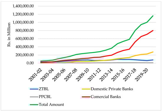 In the rural regions of Pakistan, small and marginalized farmers often rely on two primary sources of credit to cover their routine expenses: institutional and non-institutional. Non-institutional sources include money lenders, fellow farmers, commission agents, and relatives and friends; however, the funds obtained from these non-institutional avenues are frequently insufficient [7]. The institutional entities involved include Zarai Taraqiati Bank Limited (ZTBL), domestic private banks (DPB), Punjab Provincial Cooperative Bank Ltd. (PPCBL), and various commercial banks. For the fiscal year 2022–2023, the government allocated PKR 1100 billion for credit disbursements, reflecting a 28.2 percent increase from the previous year’s allocation of PKR 500 billion. Of the total credit target, PKR 801,472 million was designated for five commercial banks, PKR 78,500 million was designated for ZTBL, and PKR 274,525 million was designated for 15 DPBs. During the period from July to March of 2020–2021, a total of PKR 1100.9 billion was disbursed by all banks compared to PKR 958.3 billion during the same timeframe in the previous year, indicating an increase of 28.3 percent [8] (see Figure 1) [1]. Based on the above background for this study, we formulated the following hypothesis: