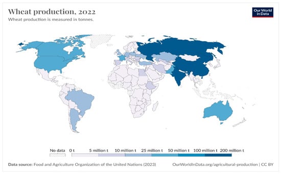 Wheat is the world’s leading food crop and is widely produced and consumed in daily life in Pakistan. In many countries, wheat is a significant cereal crop and a fundamental/staple food source. Wheat classification is determined by the season in which it is cultivated, categorizing it as either a winter crop or a spring crop. According to the report of FAO [9], during 2022, China produced 137.72 million tons of wheat, followed by India (107.74 million tons), Russia (104.23 million tons), the United States (44.9 million tons), Canada (34.33 million tons), and Pakistan (26.21 million tons) (see Figure 2). Wheat crops hold a crucial position in Pakistan, functioning as the main staple food and an essential element of the agricultural sector [10]. Approximately 80% of farmers cultivate wheat across approximately 9 million hectares, representing approximately 40% of the nation’s total arable land. This crop plays a significant role in the national economy, contributing approximately 14% to the agricultural value added and approximately 3% to the GDP [11].