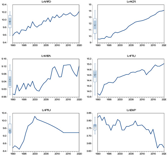 The current study used annual time-series data for Pakistan from 1990 to 2020. The data for Pakistan can be gathered from both sources, including the Food and Agricultural Organization (FAO) and Pakistan Bureau of Statistics (PBS). Table 1 shows the details of the measurement units and data sources for the studied variables. In this study, wheat production was used as the dependent variable, whereas agricultural credit was the main factor in wheat production. In addition, wheat-sown area, fertilizer use, pesticide use, and employment were used as control variables. Figure 3 reveals the trend plots of the time-series data.
