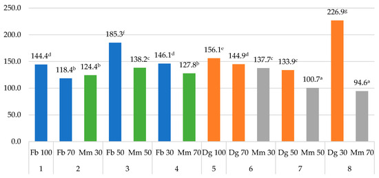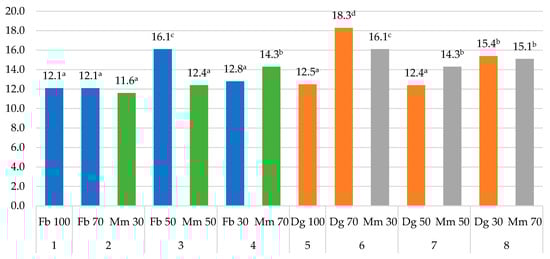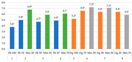 The analyzed plant species differed in the Fe content of biomass (dry matter basis). In pure-sown grasses, orchard grass accumulated more Fe (by approx. 8.0%) than festulolium (Figure 4). As a component of mixtures, alfalfa was characterized by lower Fe concentration than grasses, except for the Fb 70% + Mm 30% mixture, where the differences were not significant. During the three-year experiment, Fe content was higher in the aboveground biomass of orchard grass (226.9 mg kg−1) grown in a mixture with 70% alfalfa seeds and in the aboveground biomass of festulolium (185.3 mg kg−1) grown in a mixture with 50% alfalfa seeds. These results are consistent with the findings of other authors who have studied the ability of different plant species to accumulate selected nutrients as influenced by different soil conditions and genetic factors [1,8,11,39,50]