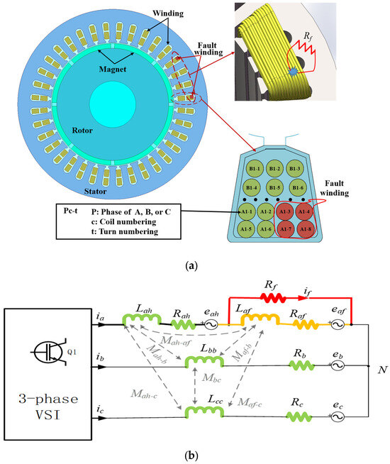 (a) Schematic representation of a motor cross-section with an ITSC fault. (b) Equivalent circuit diagram of the motor with an ITSC fault.