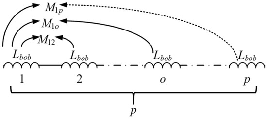When studying the self-inductance and mutual inductance relationships between coils in a phase winding, since each phase winding is composed of multiple coils connected in series, and assuming a symmetrical distribution of stator winding coils, the self-inductance of each coil is essentially consistent. However, the mutual inductance between coils is related to their relative positions. Let Lbob denote the self-inductance of a single coil in the phase winding, and Mij denote the mutual inductance between two coils in the same winding, which depends on their relative positions, as described by Expression (7).
